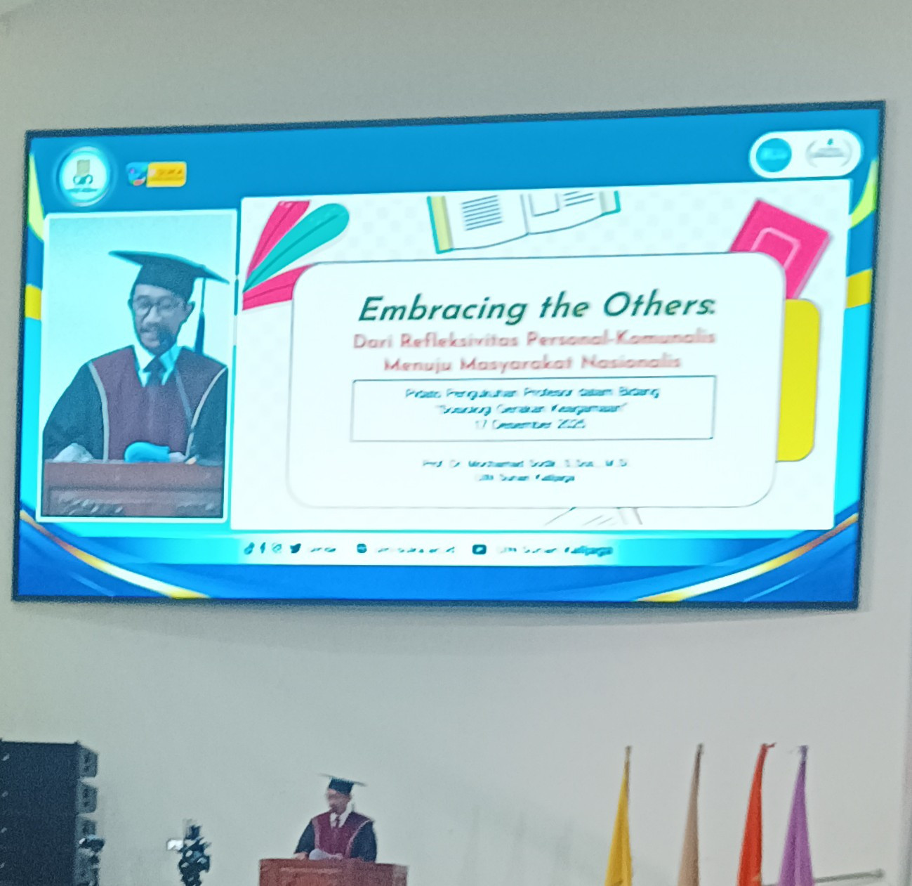 Salah satu pidato pengukuhan yang mendapat perhatian disampaikan oleh Prof. Mochamad Sodik, Guru Besar Bidang Ilmu Sosiologi Gerakan Keagamaan pada Fakultas Syariah dan Hukum. Dalam pidatonya berjudul “Embracing The Others: Dari Refleksivitas Personal-Komunalis Menuju Masyarakat Nasionalis”, ia menekankan pentingnya sikap reflektif, keterbukaan terhadap perbedaan, serta penguatan nasionalisme inklusif di tengah dinamika gerakan keagamaan. Menurut Prof. Sodik, masyarakat Indonesia membutuhkan perspektif sosiologis yang mampu merangkul keragaman, mengelola identitas keagamaan secara dewasa, dan menjadikan nilai kebangsaan sebagai titik temu. Ilmu pengetahuan, tegasnya, harus berfungsi sebagai jembatan dialog, bukan alat eksklusi.
